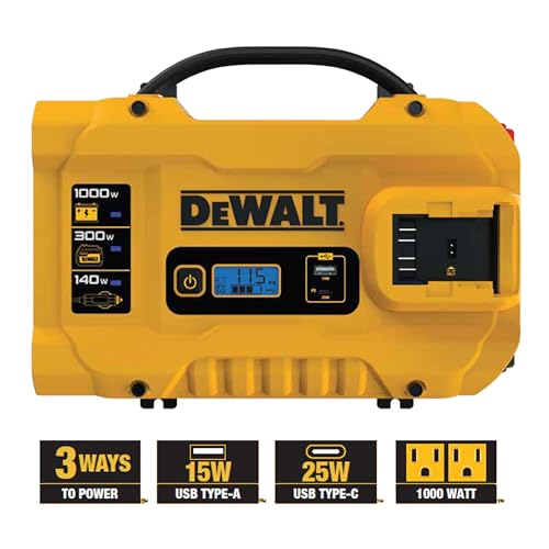 Details: Get portable power 3 ways with the DXAEPIP3W. 1000W power output with direct connection to your vehicle's battery. 300W of output power with connection to a DeWalt 20V XR 5 AH Lithium-Ion Battery (not included) Or, 140 W of output power with connection to DC source This handy unit provides dual AC outlets and 15W USB-Type A/25W USB-Type C ports to charge and power small appliances or devices. Great for job sites, tail gating, camping, power outages and more. Also works with the DeWalt FlexVolt battery on the 20V setting.